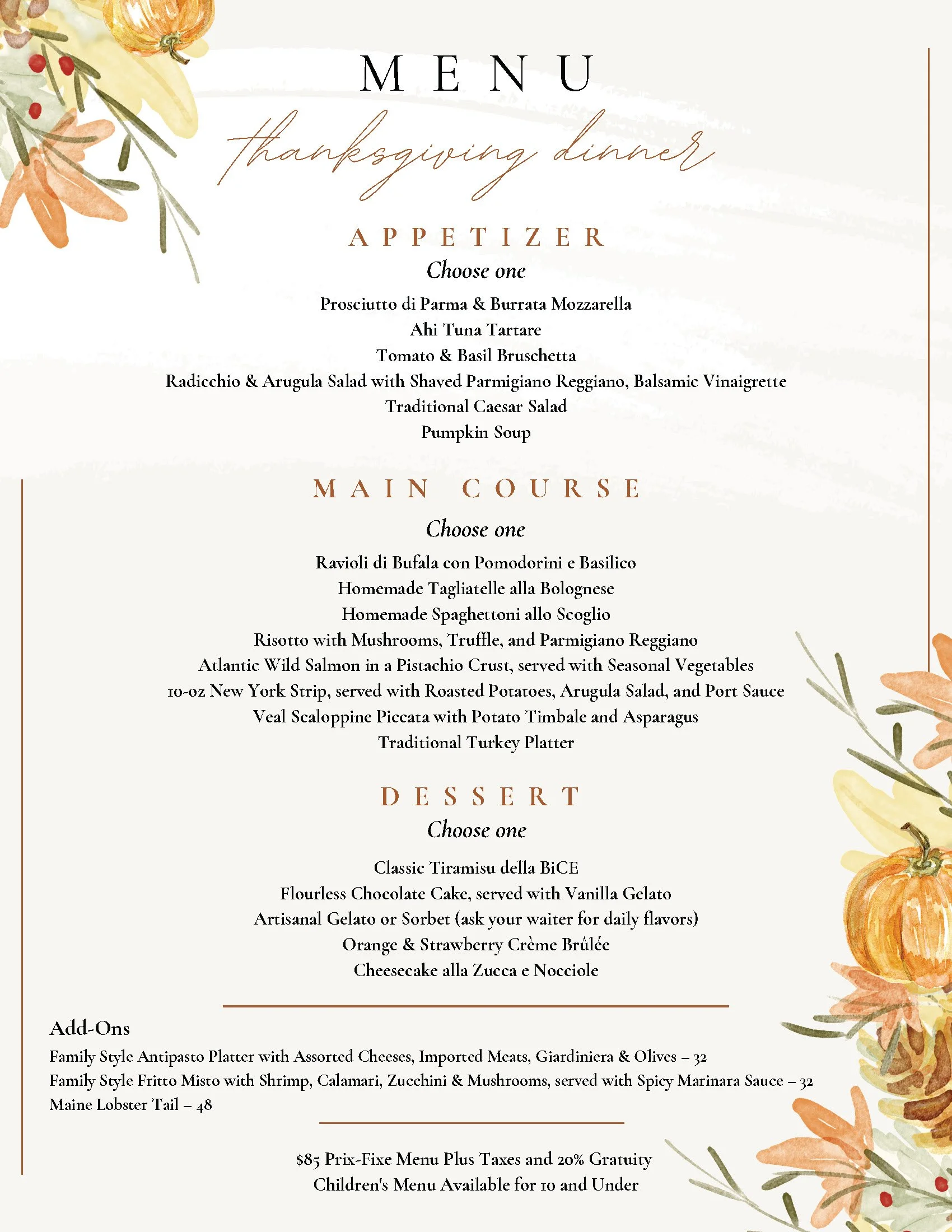 Celebrate Thanksgiving in style at BiCE Ristorante Orlando, located at Universal Studios Portofino Bay Hotel. Our special prix-fixe menu combines the best of classic Italian flavors with traditional holiday dishes, making it a perfect choice for those looking to enjoy something unique this Thanksgiving. Whether you're craving Prosciutto di Parma, Ahi Tuna Tartare, or our Traditional Turkey Platter, there’s something for everyone.